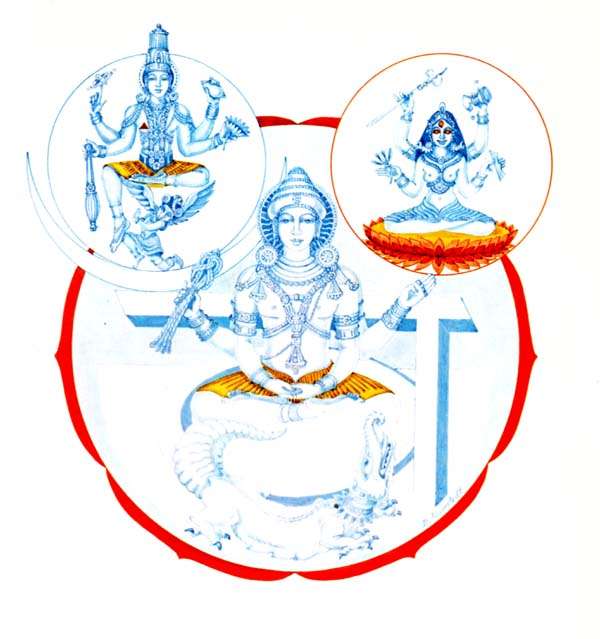 Gottheiten. Namen im Uhrzeigersinn: Varuna, Vishnu, Rakini
