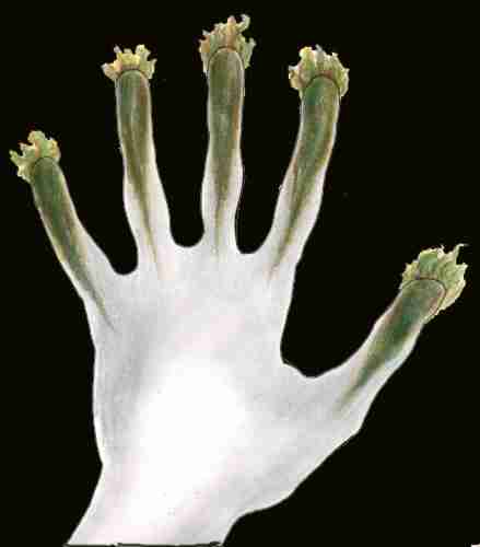 Fingerspitzen strahlten 5 bis 6 cm lange Lohen in oranger Farbe.