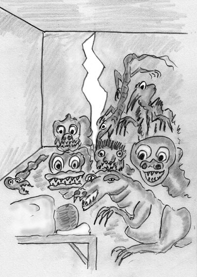 Auf einmal hatte ich ein klares, deutliches Sehfeld vor mir. Es war gruselig lebensecht. Ich sah mich im Bett liegend und von einer Unzahl dämonischer Wesen umgeben. Der ganze Raum war hiervon erfüllt und nach rückwärts zu türmten sie sich auf, als ob sie übereinander oder auf einer Tribüne stehen würden. Sie sahen weder menschlich noch tierisch aus und hatten bizarre Gestalten und manche zeigten ihre langen Klauen. Die von ihnen mir am nächsten stehende Dämonengestalt war nur ca. 1 1/2 Meter entfernt und hatte ihre zuschlagbereiten 'Hände', mit ca. 15 bis 20 cm langen, kantigen Klauen, mir zugewandt. Mit einer gewissen Anstrengung konnte ich diese Wesen in Bann und von mir fern halten. Ich sprach einigemale OM und dann OM Christus OM, in der Hoffnung die Wesen mit diesen heiligen Silben zu vertreiben. Wie zum Hohn sprachen etliche von ihnen diese Mantren nach, jedoch in schauderhafter Dissonanz. Als ich einsah auf diese Art nicht weiterzukommen, und daß meine innere Kraft allmählich nachlassen würde, rief ich mich blitzschnell in den Wachzustand zurück und drehte mich fast gleichzeitig im Bett um (zur zusätzlichen Körperbelebung). Über diese überaus schnelle Reaktion war ich anschließend mit mir sehr zufrieden. Das Gesehene beeindruckte mich noch lange."
