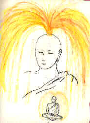 Wir stellen uns eine Bahn von feuriger Energie vor, welche entlang der Wirbelsäule fließt. Vom Muladhara beginnend strömt sie aufwärts, um aus dem Meditationschakra springbrunnenartig als Licht hervorzutreten. Dieses Licht verteilt sich über die Oberfläche unseres Körpers. |