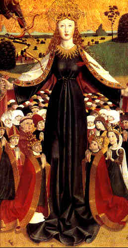 Um dieses Gefühl zu vertiefen meditieren wir jeden Tag auf die Göttliche Mutter und stellen sie uns so wie auf dem Bild vor. Ihr Mantel der Liebe und des Segens hüllt uns ein und beschirmt uns. Wir bauen einen kleinen Altar, stellen dort ihr Bildnis auf, zünden eine Kerze davor, stellen eine Vase mit Blumen dem Bild zur Seite. Erst dann und wenn wir uns die Hände gewaschen haben, als Symbol der äußeren und inneren Reinigung, dann setzen wir uns davor und beten und meditieren.