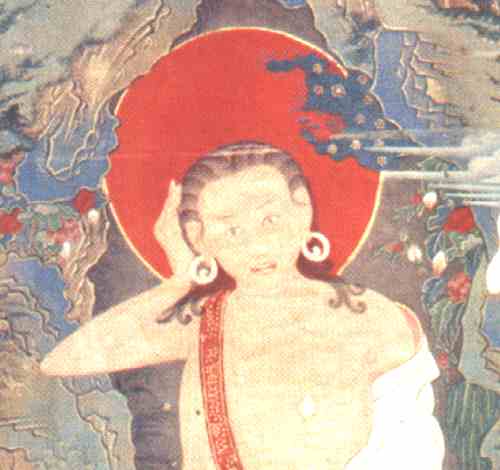 "Ich möchte Dir noch eine Frage stellen. Hältst Du es für möglich, daß eine zweite Person, Dir gegenüber sitzend, nur durch Augenkontakt in der Lage ist von seinem Körper in den Deinen zu wechseln ?!" (Ulli) Meine Antwort: Von Yogis wird das berichtet - Pho Wa = Bewußtseinsübertragung, eine geheime Technik in Indien und Tibet. Ich kenne sie nicht, würde es auch nicht machen. Es gibt aber etliche Geschichten darüber. ".... Es tränten mir schon die Augen, als ich in Ihrem rechten Auge eine im Lotussitz sitzende Gestalt sah. Ich glaube nicht, das dies ein menschliches Wesen war, denn er hatte was bedrohliches an sich. Er saß da und starrte mich an und durch ihn hindurch floß ein gebündelter Lichtstrahl (blau/weißes Licht). Dieses Licht floß in mein linkes Auge in mich hinein. Es schien neutral zu sein, aber ich wunderte mich darüber, dass dieses Wesen extrovertierte und nicht introvertiert meditierte. Ich fühlte mich bedroht. Ich hätte doch sonst die Leere, oder kein Echo wahrgenommen. Ich sah in dem Gesicht der Frau das Böse, und zwar oft. Und warum bekam ich bei den Übertragungen immer das Gefühl, es würde mir jemand einen Stein hinter der Stirn manifestieren? " (Ulli) Im Prinzip ist die Bewußtseinsübertragung ein magischer Vorgang und wurde von alters her im Yoga ausgeübt (Geheimlehre) nicht immer im guten Sinn - aber über die mißbräuchlichen und schlechten Anwendungen will ich nichts schreiben. Da gibt es Geschichten vielerlei Art..... Wollen wir uns deshalb lieber den spirituellen Anwendungen widmen. Die Yogis, speziell jene, welche Shabd Yoga (= Ton Yoga) betreiben, legen größten Wert darauf auf welcher Seite der Ton gehört wird: rechte Seite ist die gute Seite, auf der linken Seite sind höllische Töne. Demnach war es ein gutes Zeichen, dass diese Gestalt im rechten Auge zu sehen war. Dass das Bild in Dein linkes Auge einstrahlte ist deshalb der Fall, weil die Kraftlinien der Augen nicht gekreuzt werden sollen. Nachfolgend ist ein Bild von Milarepa (ein ganz großer tibetischer Yogi) der mit dem rechten Ohr auf Töne hört (weist auch auf seine Lieder hin, denn Milarepa war auch ein großer Dichter).