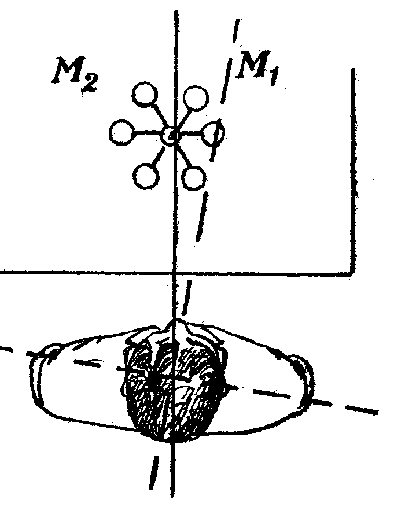 "Der Apparat bleibt in Ruhe, solange wir unsere symmetrische Stellung zu ihm beibehalten. Drehen wir uns aber ein wenig nach rechts oder links, so daß unsere Medianachse nach M1 oder M2 zeigt, so beginnt die Anordnung zu drehen (langsamer als die mit der Hand bewegten Zylinder). Statt den Körper zu drehen, kann man sich auch nach rechts oder links versetzt hin setzen.