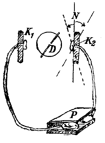 Anornung mit einer Kompaßnadel fix montiert auf dem Zylinder, einer Skala und weiters einen Richtungsmagneten auf einer Schiene mit Abstandsskala.