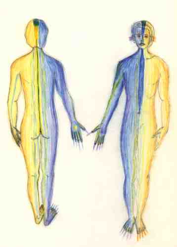 "Bei der ersten Prüfung des ganzen Körpers erscheint zunächst die rechte Seite durchweg blau, die linke durchweg gelb. Nach längerer Betrachtung aber bemerkt der Sensitive Farbenbänder, die die Seiten durchziehen und sich gegen die Hauptfarbe hin nuancieren, rechts gegen blau, links gegen gelb."