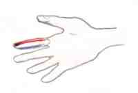 (Detto) "Die Arme zeigen für sich das selbe Bild; der rechte scheint zunächst zur Gänze blau, der linke gelb. Ausgestreckt aber, mit der Handfläche nach rückwärts, weist der rechte für den Sensitiven längs seiner ganzen Innenseite, d.h. auf der Seite des Daumens, im Indigoblau einen schmalen gelben Streifen auf, der linke im Orangegelb einen dünnen blauen Streifen an der Seite des kleinen Fingers."