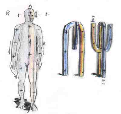 Odfluß nach Durville (verwendet umgekehrte Polbezeichnungen [+, -] wie Reichenbach)