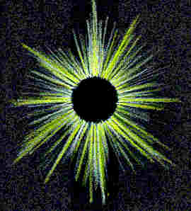 Als ich mich abends zur Meditation niedersetzte, kam mir der Gedanke, das Stirnchakra zu beleben. Noch bevor ich mich klar entschieden hatte, welche Technik ich dabei anwenden sollte, tauchte ein strahlenförmiges Chakrabild auf: in der Mitte befand sich ein matt-schwarzes Loch und davon ausgehend, in allen Richtungen, waren Lichtstrahlen.