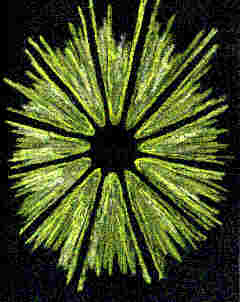 Das Bild war sehr regelmäßig aufgebaut. Indem ich rasch die Lichtemanationen eines Viertelkreises zählte, erkannte ich, daß es sich um einen 12 strahligen "Stern" handelte. Dabei sah ich, daß einzelne Lichtstrahlen weit in den umgebenden Raum hinausragten.