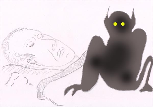 "In a dream I felt myself lying in the bed. An unknown, shadow like person entered, hidden by a kind of paravan. I wanted to leave the bed to be ready against an offend. Shocked I became aware, that I was unable to move any limb. I wanted to call to my wife, but I could only utter some guttural sounds * ).The intruder slowly, step by step approached. When the dark person already had come to the end of my bed, I had the idea, that breathing was still under my control. Breathing in by simultaneously snoring as hard and loud as possible I had success and immediately awoke."