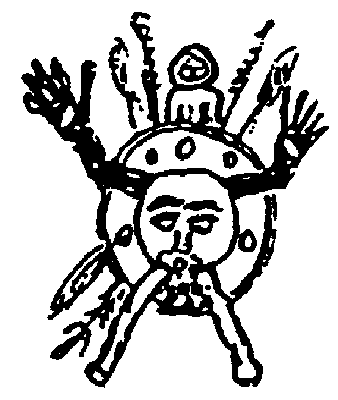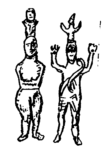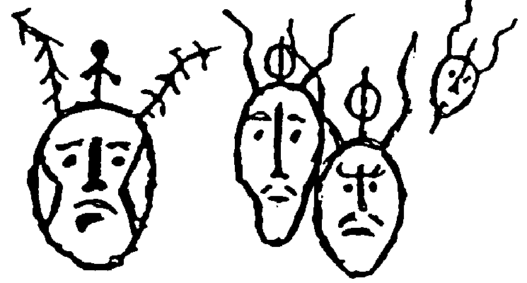 In the times when the first religions developed, earth and universe was seen more differentiated, which caused an inflation of gods. The human body was thought as a microcosm, structured in the same way as the macrocosm. In this way earth, the region of fertility was thought in the abdomen and the sky-heaven was thought to be located in the head. For that reason Shamans, priests and heroes who were thought to belong to the world of gods and demons left their body at the location of the sky region. Their soul-body was head-born. Below you can see some rock drawings, which show the process of the head-born soul-body leaving the body.