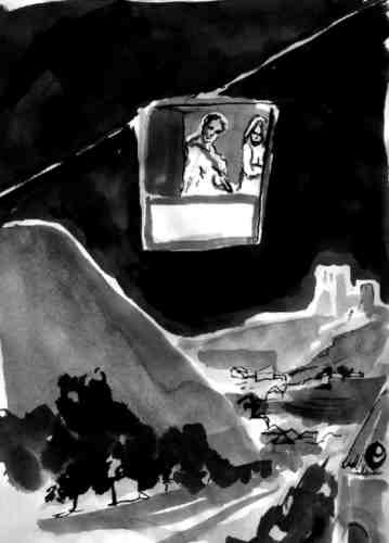 Auf der Kuppe eines Hügelrückens bleibt der Lift stehen, ich steige aus und sehe mich um. Auf der rechten Seite fällt der Hügel sanft ab zu einer Meeresbucht, umsäumt von einem mediteranen Dorf, mit einstöckigen Häusern und Straßen mit rundgeschliffenen Kopfsteinpflaster. Ich gehe hinunter und auf halber Höhe beginnt ein Fort mit Zinnen und winzigen Gucklöchern. Es ist ein langes Gebäude, das sich hinunter bis zur Hauptstraße erstreckt. Dort ist auch ein Eingang zum Fort, doch ich darf nicht hinein, der Portier verwehrt mir den Zutritt. Gegenüber vom Eingang des Fort ist eine Kapelle, da gehe ich hinein. Dort versuche ich mit dem Priester und drei vier Leuten die dort sind zu sprechen, aber es entwickelt sich kein Gespräch. Ich gehe weiter, gelange zum Kai, gehe dort noch ein bisschen spazieren, schaue auf das Meer, betrachte einen rostigen Anker, der auf dem Pflaster (als Art Dekorationsobjekt) liegt und wache auf.