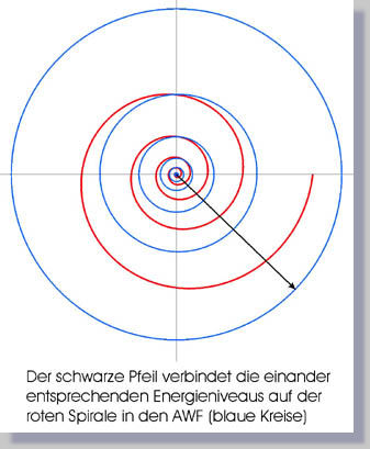 Nach dem Universal-Prinzip zeigt die Spirale den Verlauf der Entwicklung von einem Extrem zum anderen (Materie und Raum). Die Linie der Spirale beginnt im Kern und durchläuft danach alle Energie-Niveaus vom ersten Ausgleich-Wellen-Feld bis zum höchsten Ausgleich-Wellen-Feld (Bild). Legt man eine radiale Linie in die Spirale, verbindet diese alle einander entsprechenden Energie-Niveaus in aufeinanderfolgenden Oktav-Bereichen (Ausgleich-Wellen-Feld). Das Perioden-System der Elemente könnte in dieser Form der Realität genauer entsprechen als das zur Zeit geläufige.