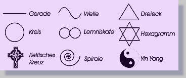 Hier sind einige Symbole in Form von Bildern dargestellt. Auch Raum-Wellen angeregter Objekte wie z.B. Töne, Düfte oder Farben können als Symbole wirken. Unser Körper, bis hin zur DNS besteht aus einer Vielzahl miteinander vernetzter Symbol-Antennen.Die Symbol-Deutung ist eine Kunst des analogen Denkens.
